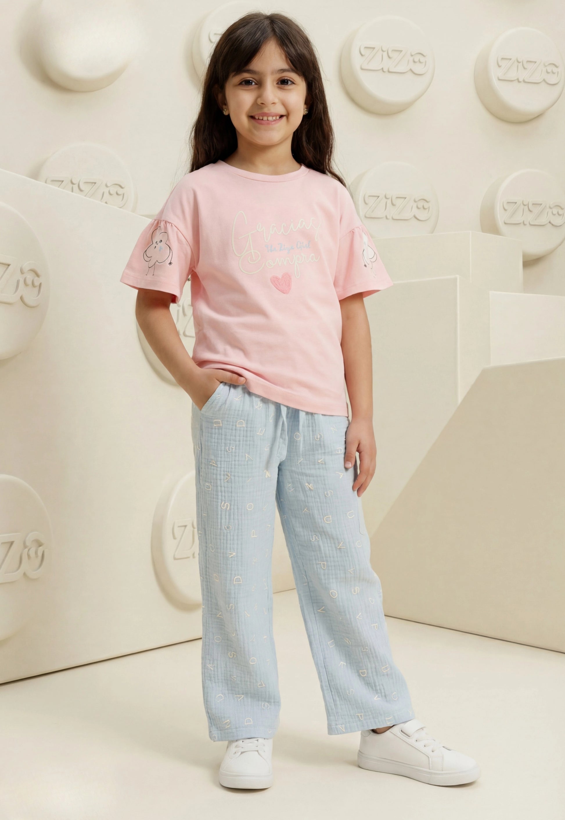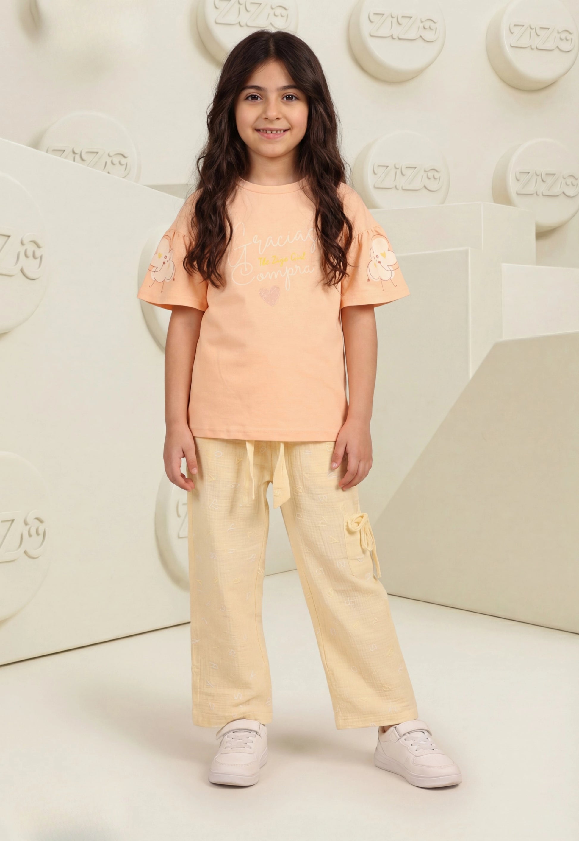 e set includes a short-sleeved top featuring a playful design with the text “UP YOUR LIFE” and a colorful floral graphic, adding a fun and trendy vibe. It is paired with matching peach pants that offer a comfortable fit with an elastic waistband, ensuring ease of movement. The outfit is completed with white sneakers, making it suitable for both sleepwear and casual wear. Made from high-quality, breathable fabric, this pajama set provides durability and comfort for active young girls.