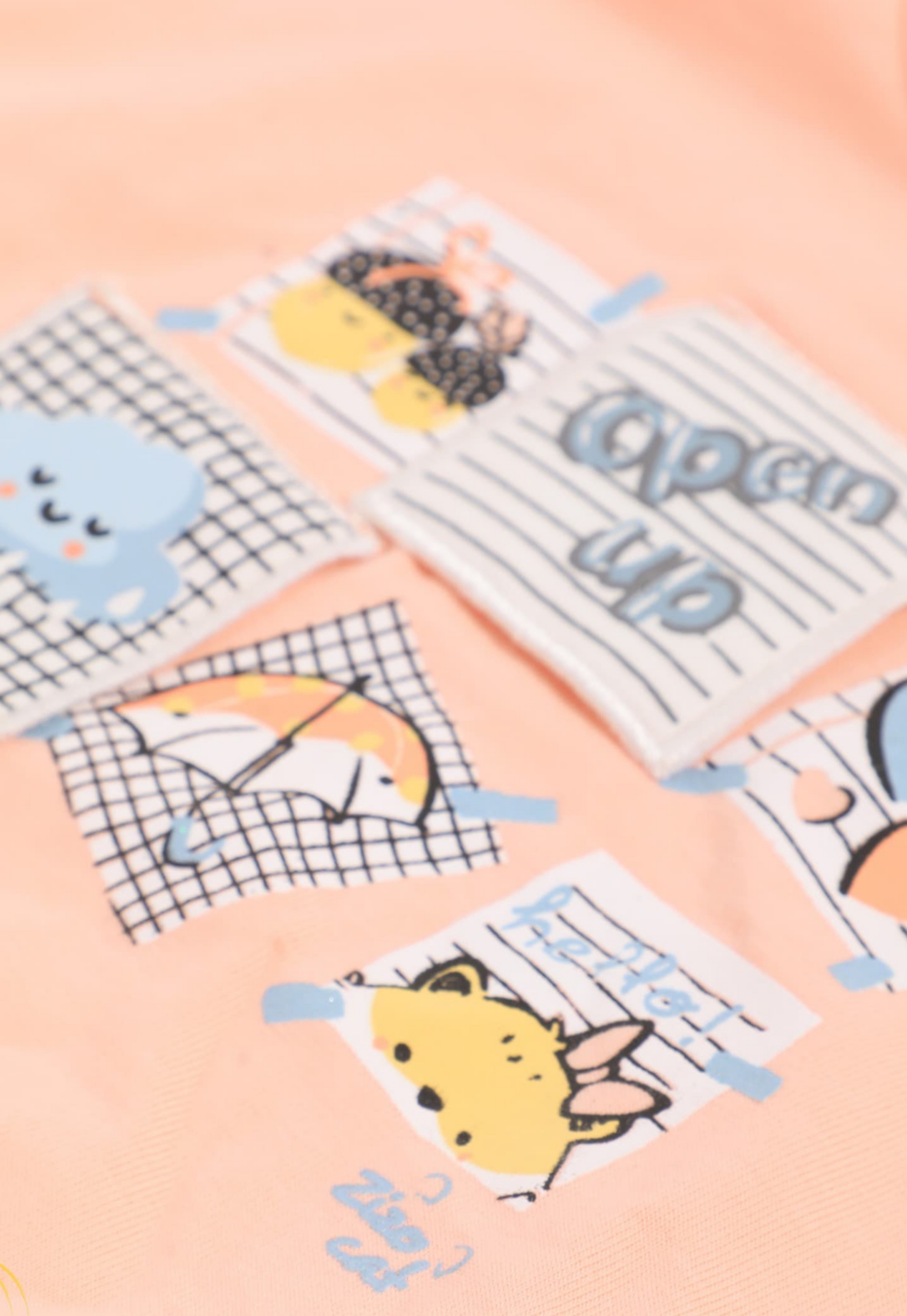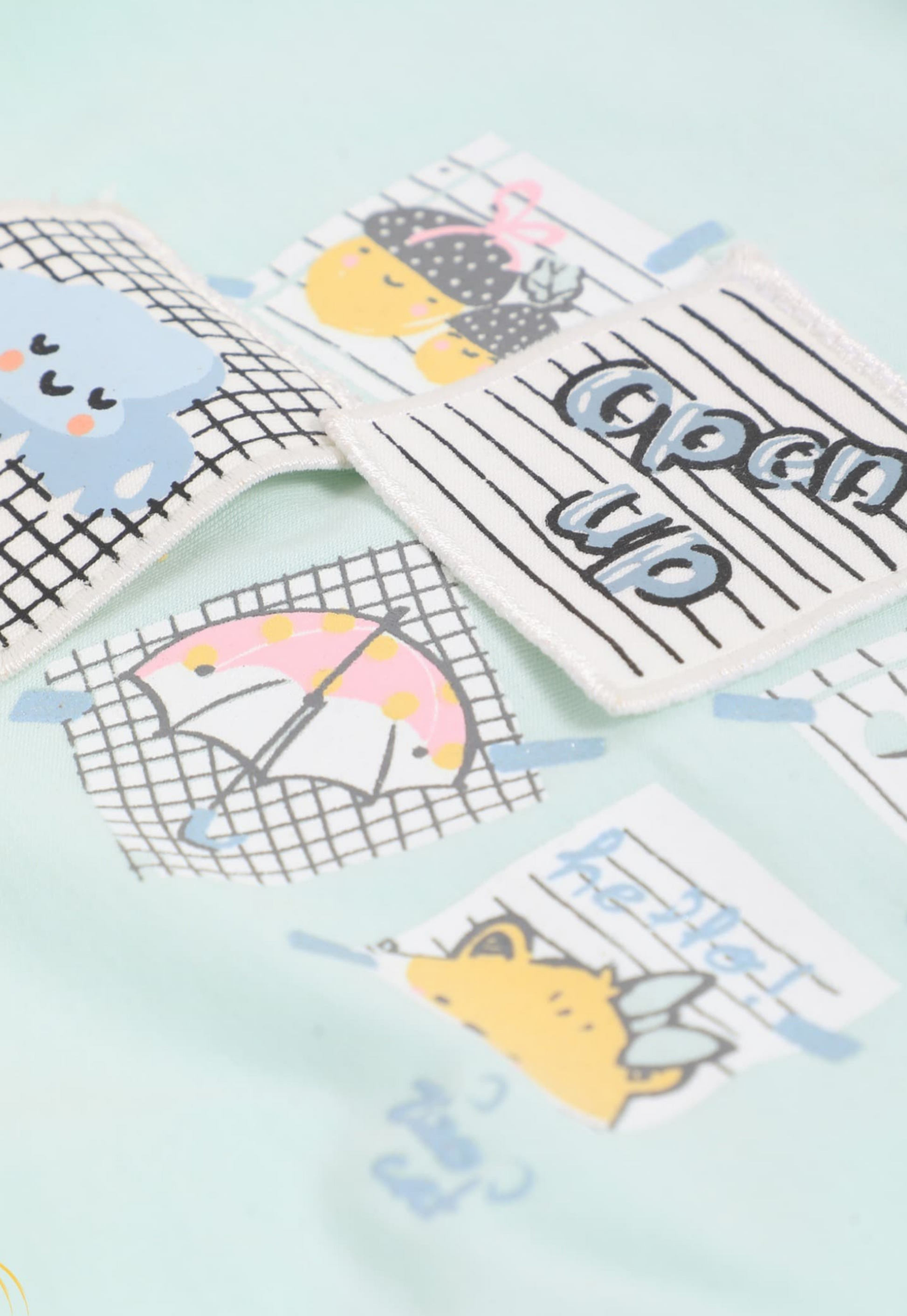 The set includes a short-sleeved top and matching shorts, crafted for both comfort and style. The top is a soft mint green color, featuring a playful design with multiple colorful patches, including a cloud, hearts, a cupcake, and the text “Wake Up,” adding a whimsical touch. The top has an elasticated hem with a drawstring for a snug fit. The shorts are a coordinating dusty pink shade with side pockets and matching drawstring ties at the waist, enhancing the cute and practical design. Made from lightweight, breathable fabric, this pajama set ensures a cozy and comfortable fit, perfect for warm nights or casual wear.