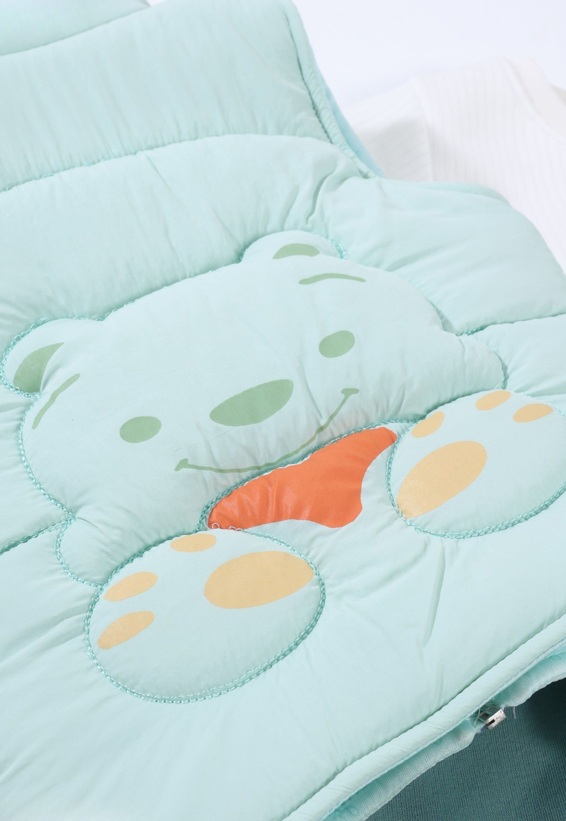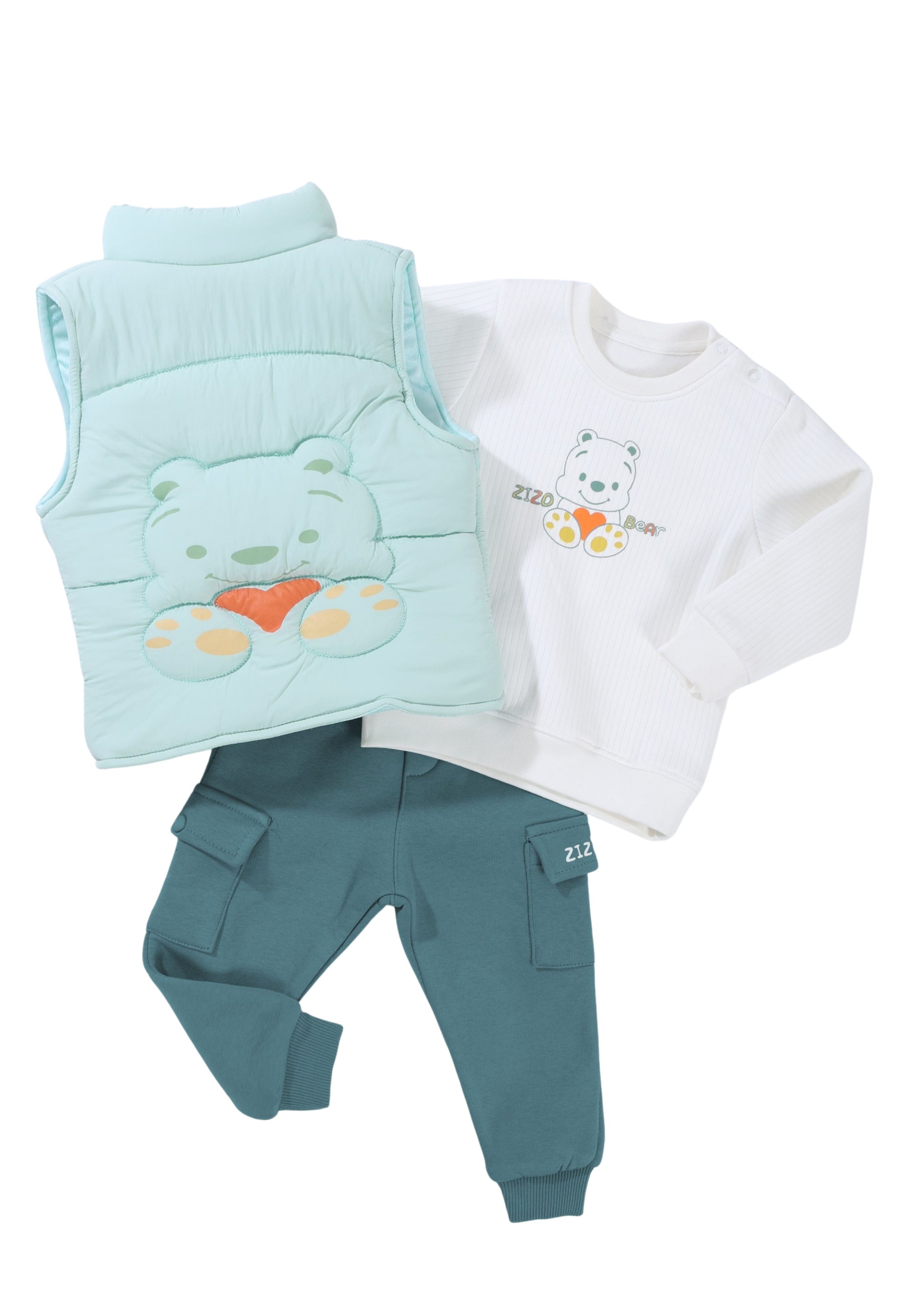 الطقم يحتوي على فيست مبطن برسمة دب بارزة على الظهر، سويتشيرت قطني برسمة الدب Zizo Bear، وبنطلون كارغو عملي بجيوب جانبية.