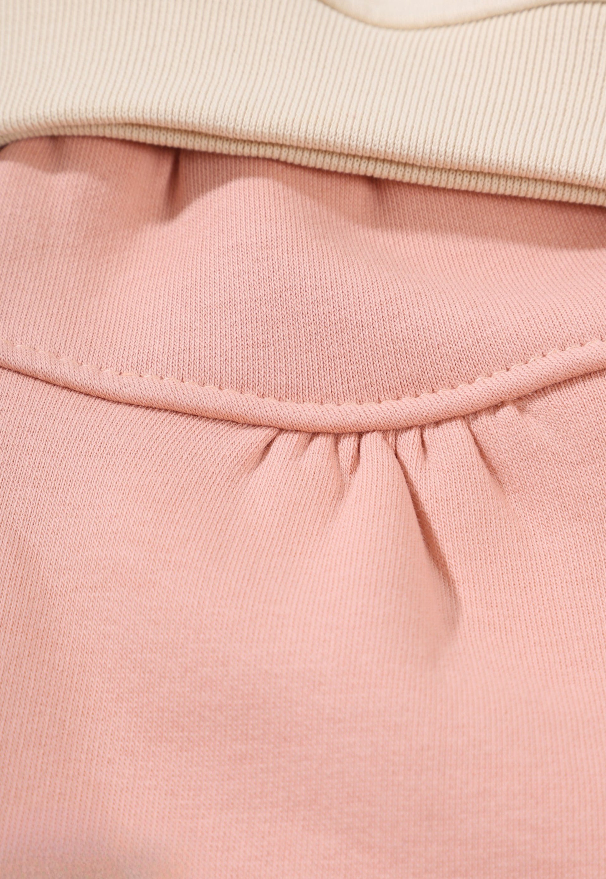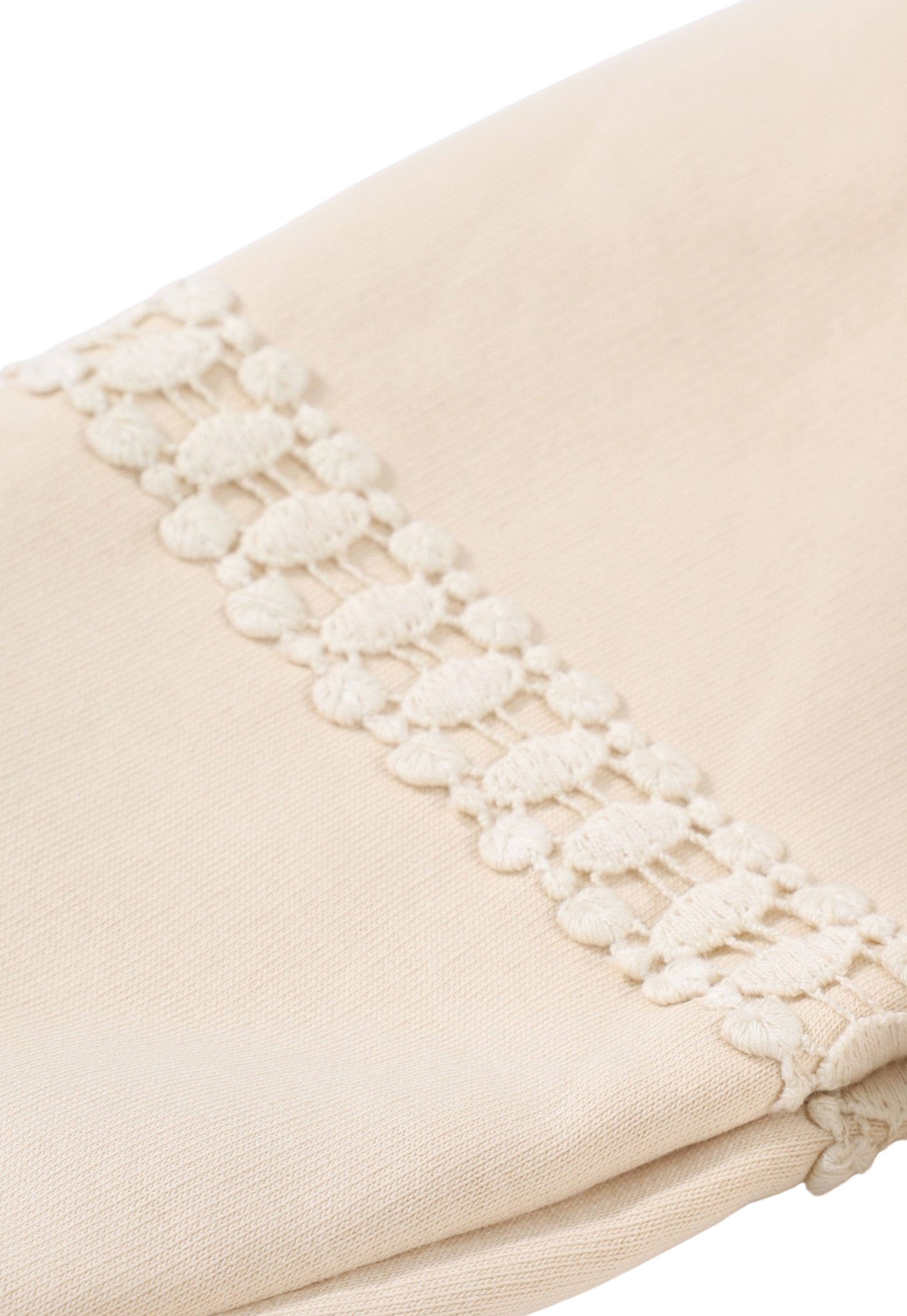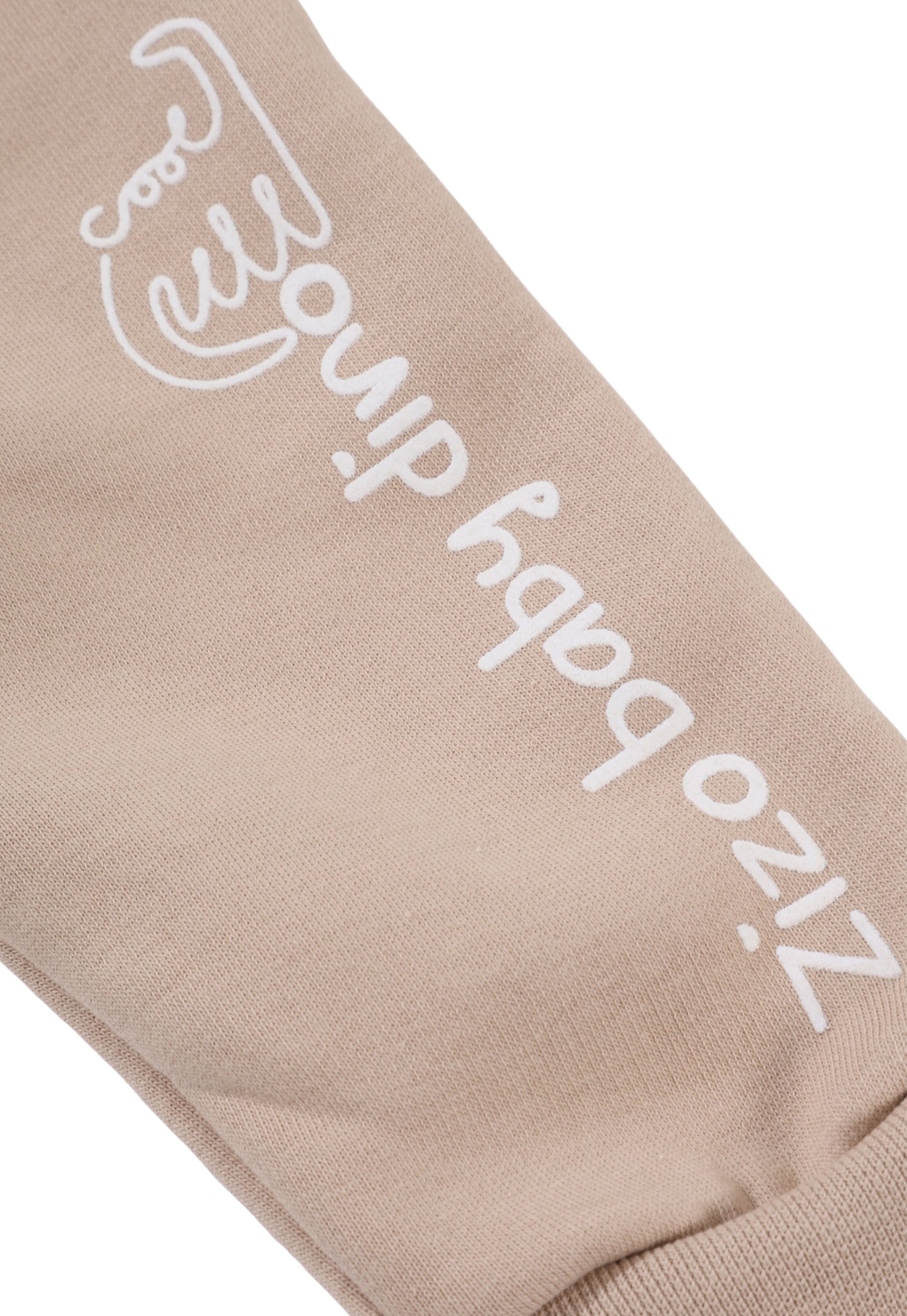 الطقم مكون من سويتشيرت بأكمام منفوخة بتفاصيل دانتيل راقية وبنطلون رياضي بنفس الطابع العملي عليه طبعة مميزة تحمل شعار (Zizo Baby Dino).