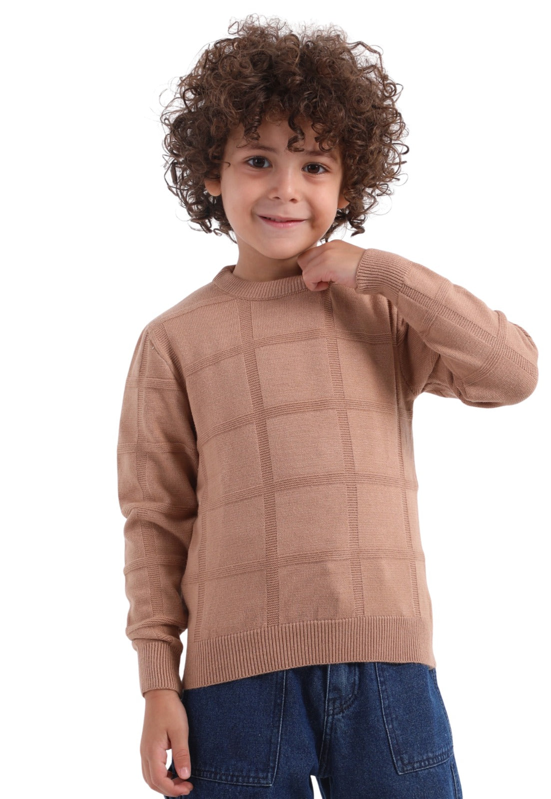 بلوفر تريكو شتوي للأولاد بتصميم أنيق وبسيط مع نقشة مربعات خفيفة تضيف لمسة شيك بدون مبالغة.