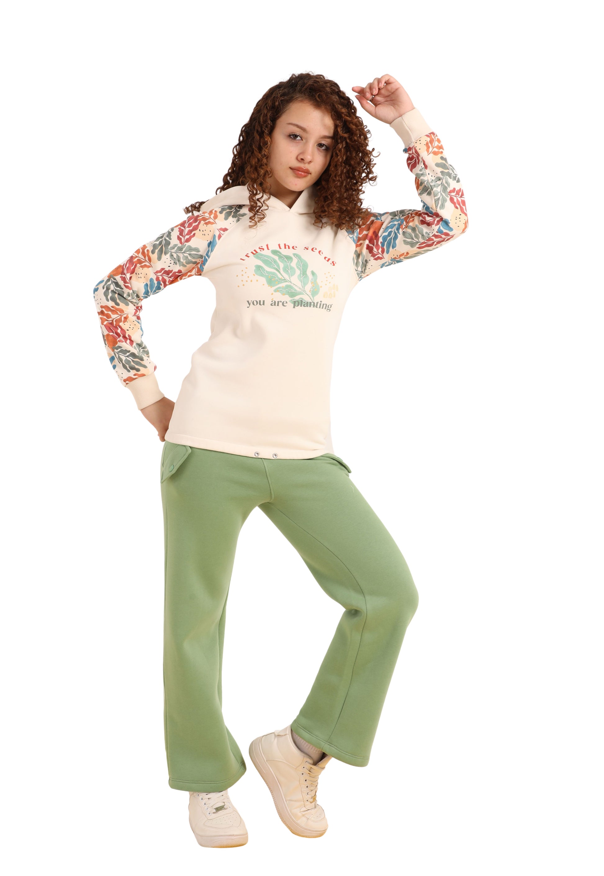 الأكمام منقوشة بالكامل بنقشة أوراق ملونة تضيف لمسة فنية ومبهجة.