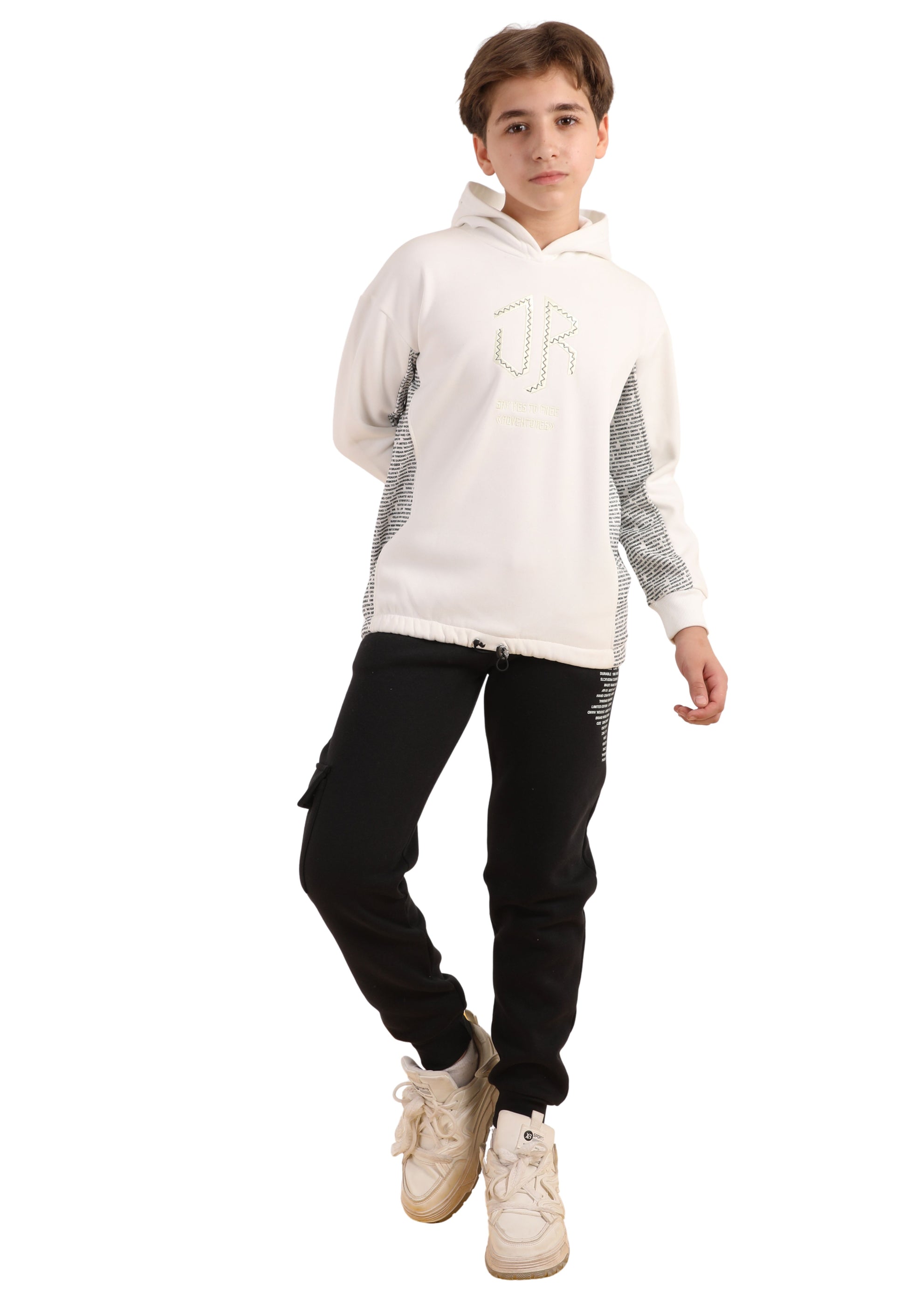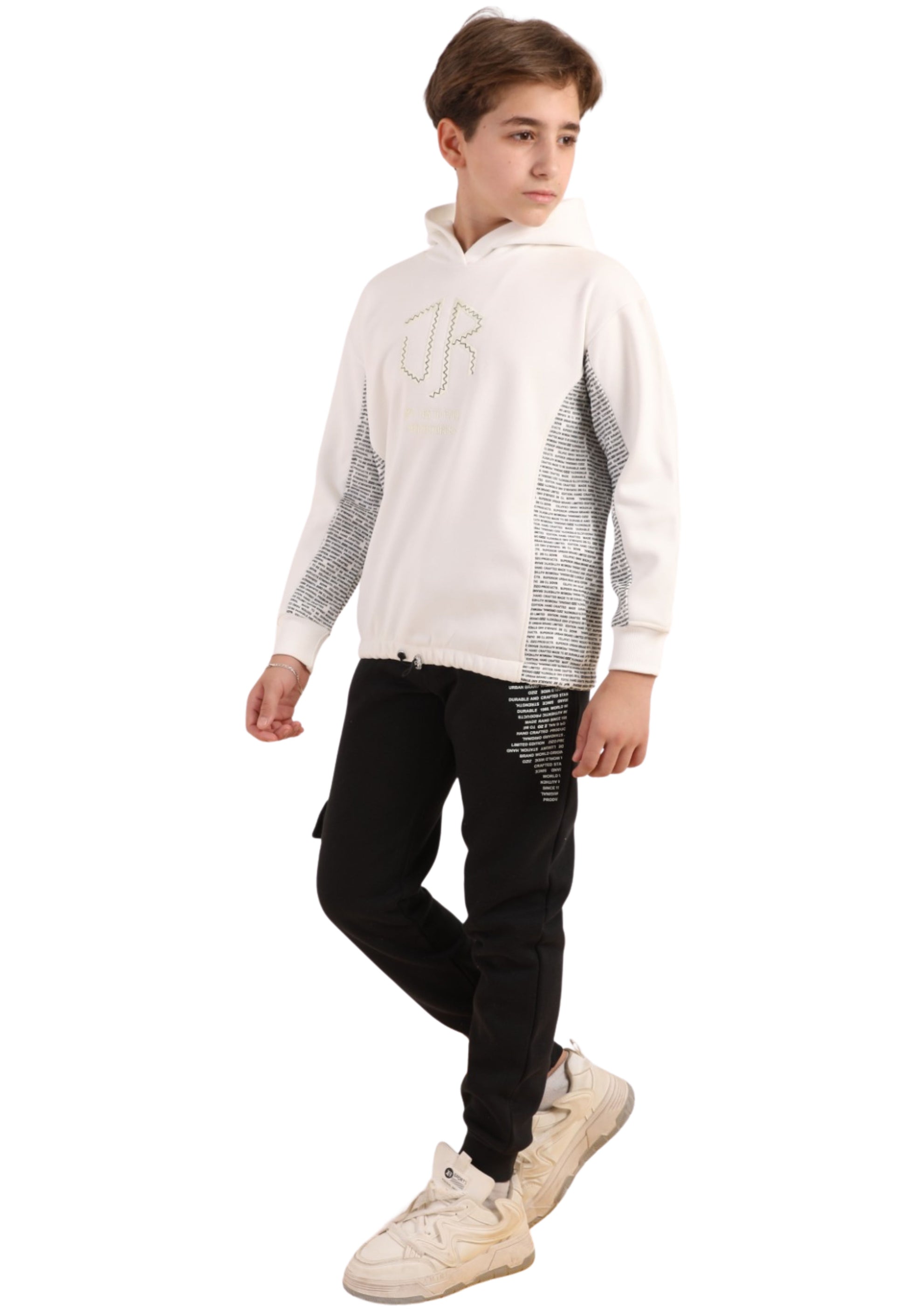 هودي دافي بخامة ناعمة، عليه لوجو مطبوع بحروف بارزة، مع جوانب وأكمام منقوشة تضيف شكل شبابي ومختلف.
