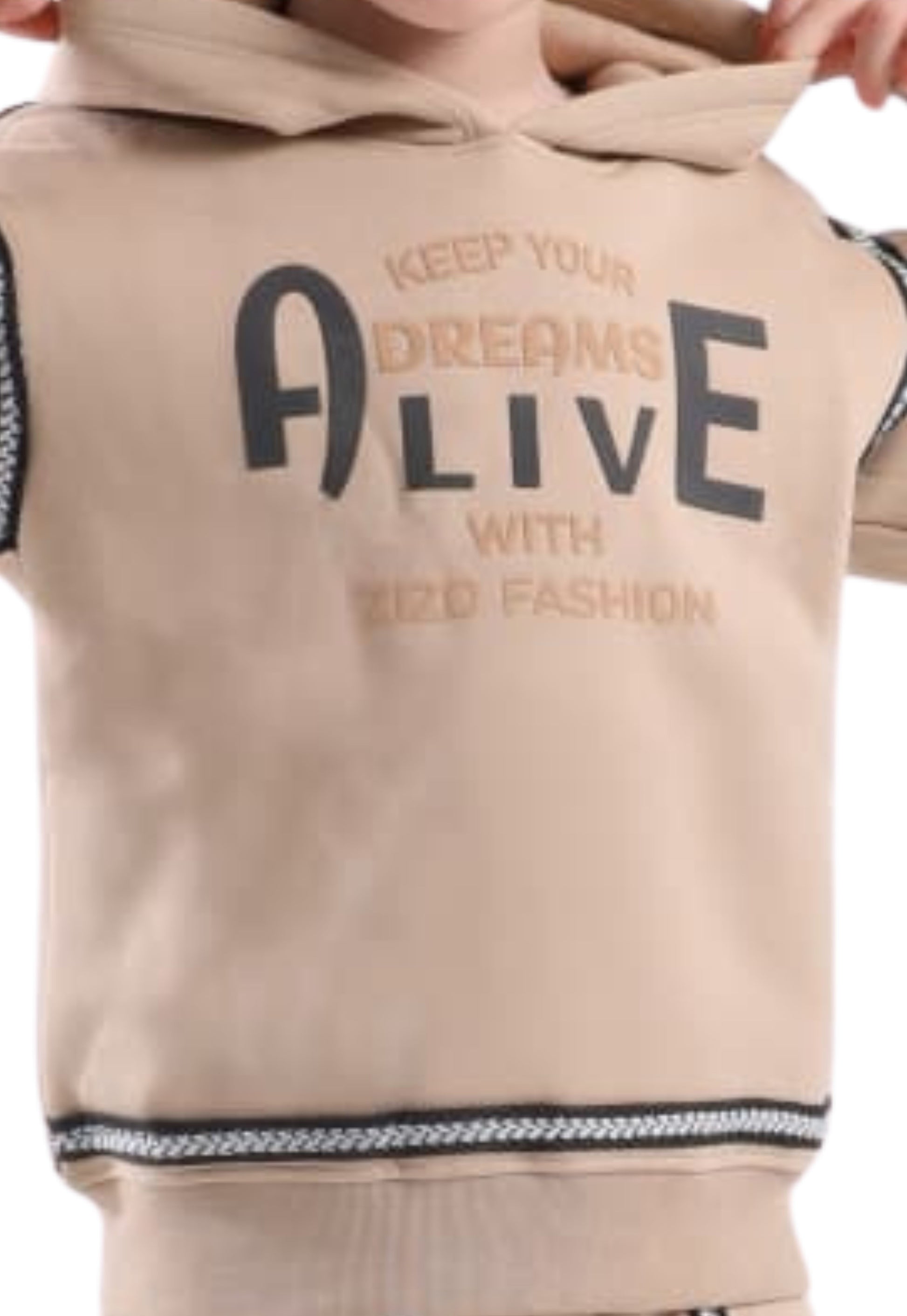 القطعة العلوية عبارة عن هودي بتصميم "KEEP YOUR DREAMS ALIVE" مطبوع بخط بارز (Embossed Print) يضيف لمسة فخامة وجرأة للوك.