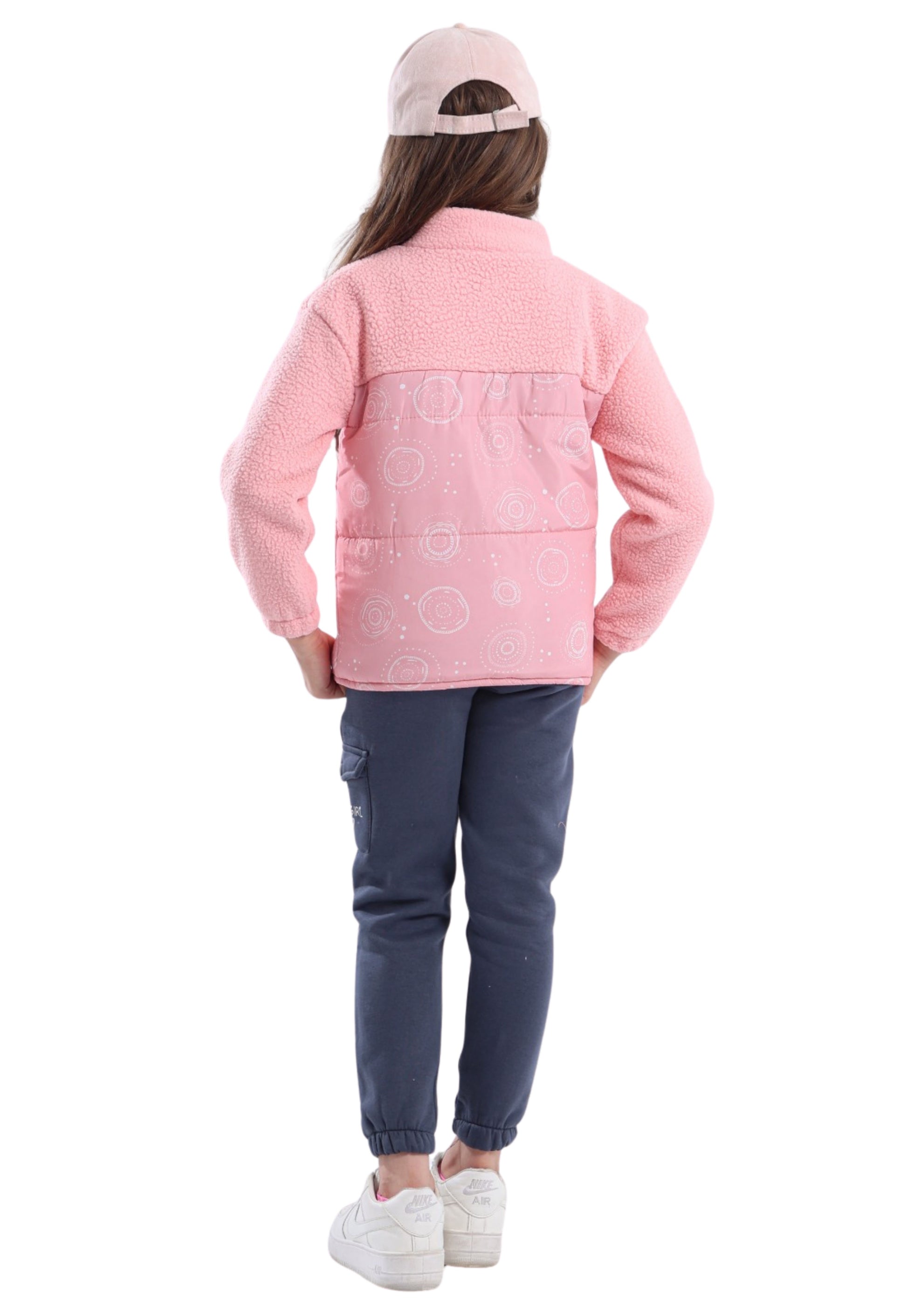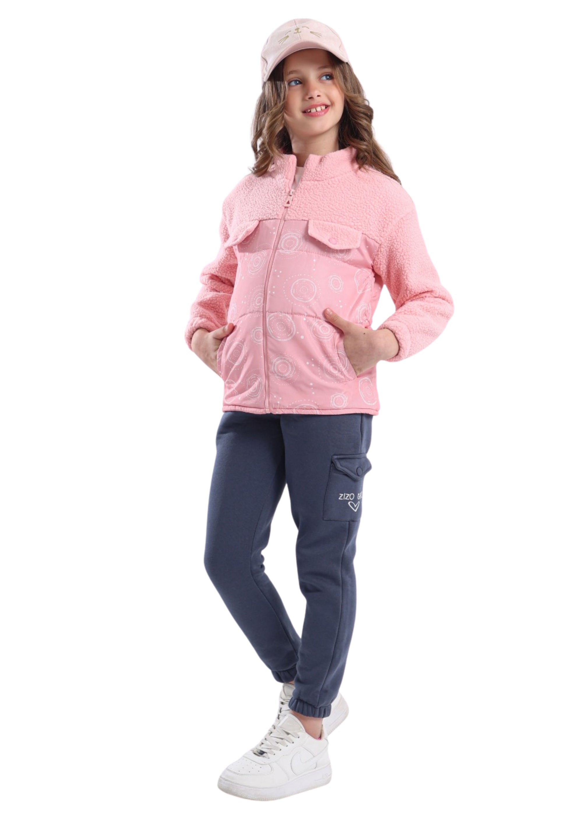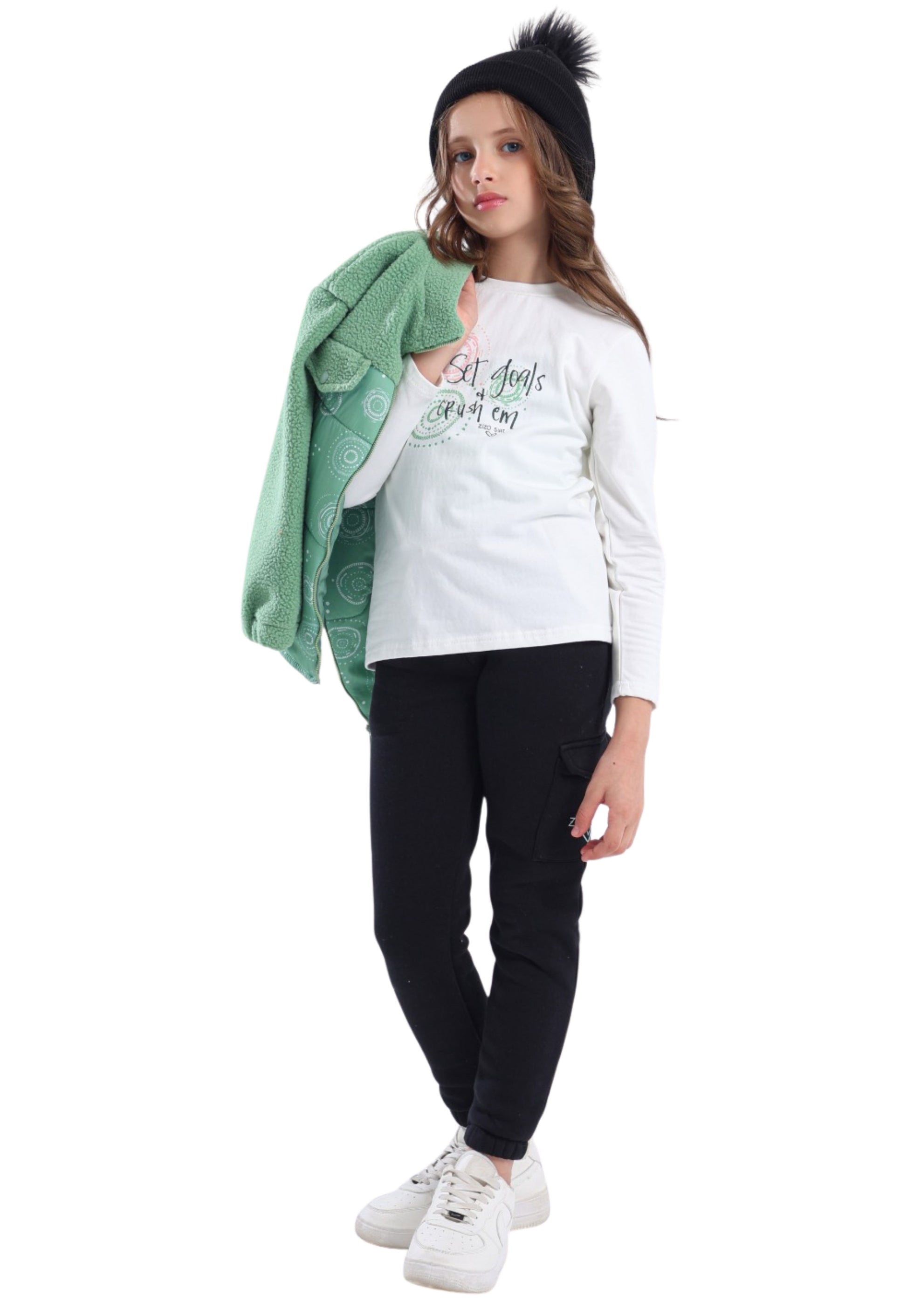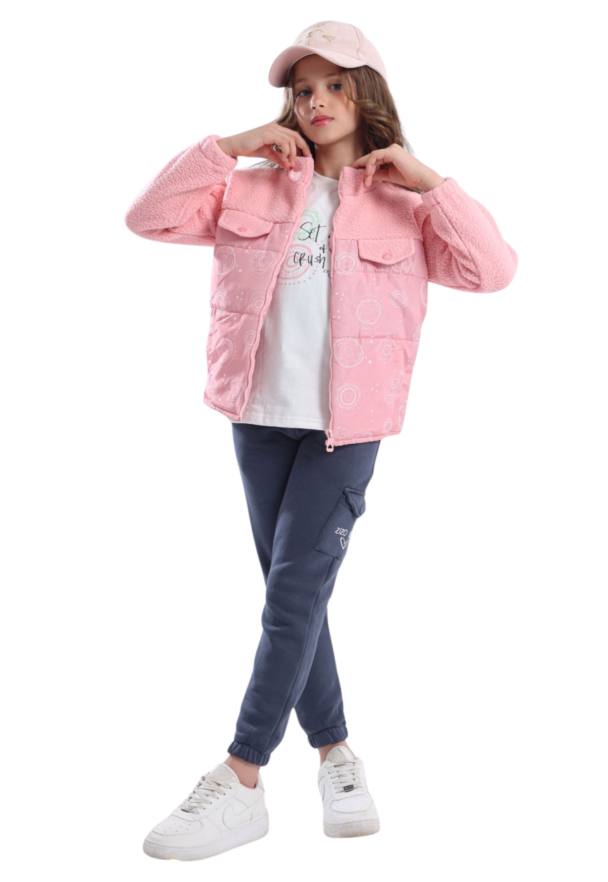 مكوّن من جاكيت فرو “Sherpa” بنقشة دوائر فنية، وتيشيرت قطن أبيض مطبوع بعبارة “Set goals & crush ’em”، مع بنطلون فليز بجيب كارغو جانبي يحمل شعار Zizo Girl.