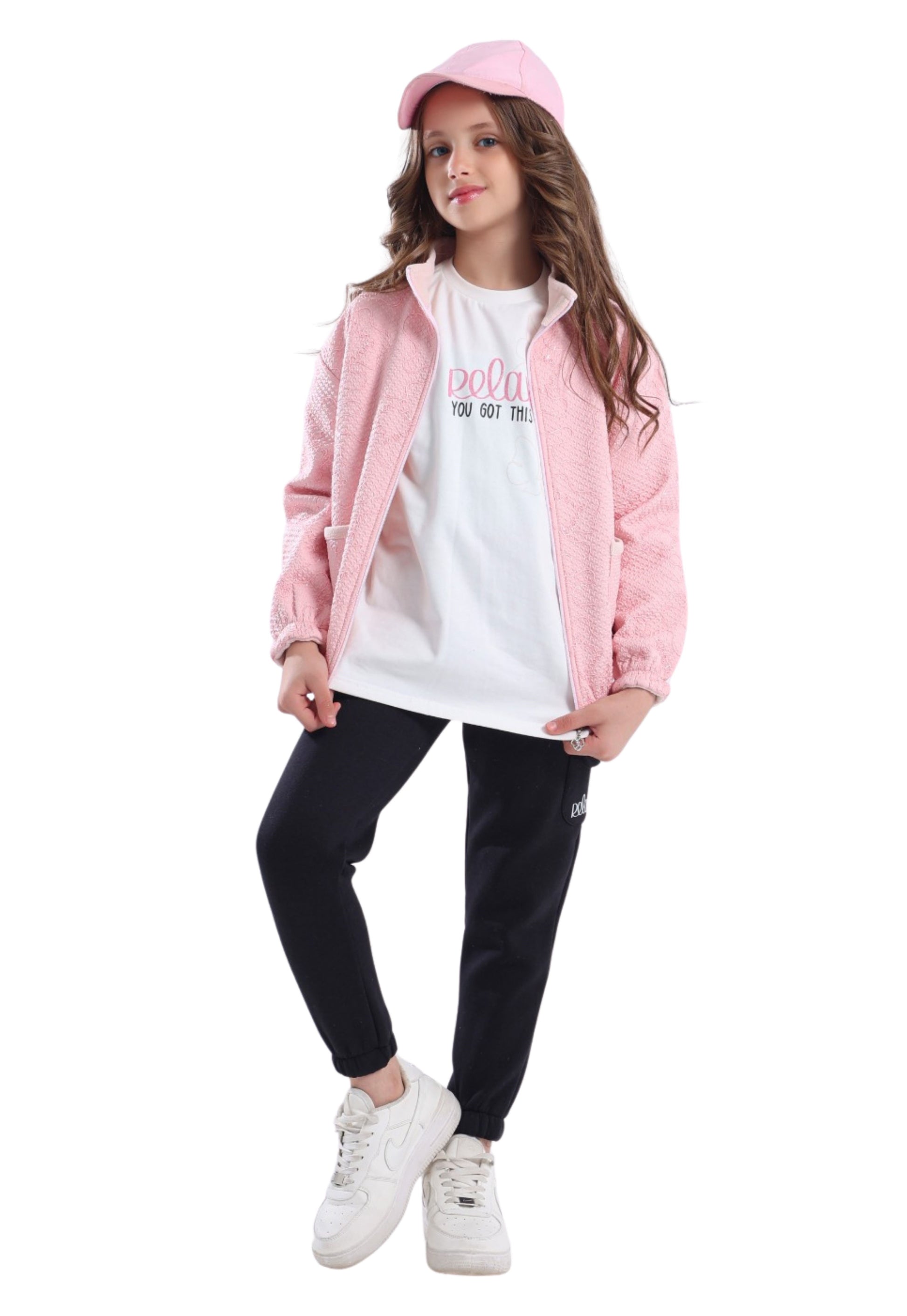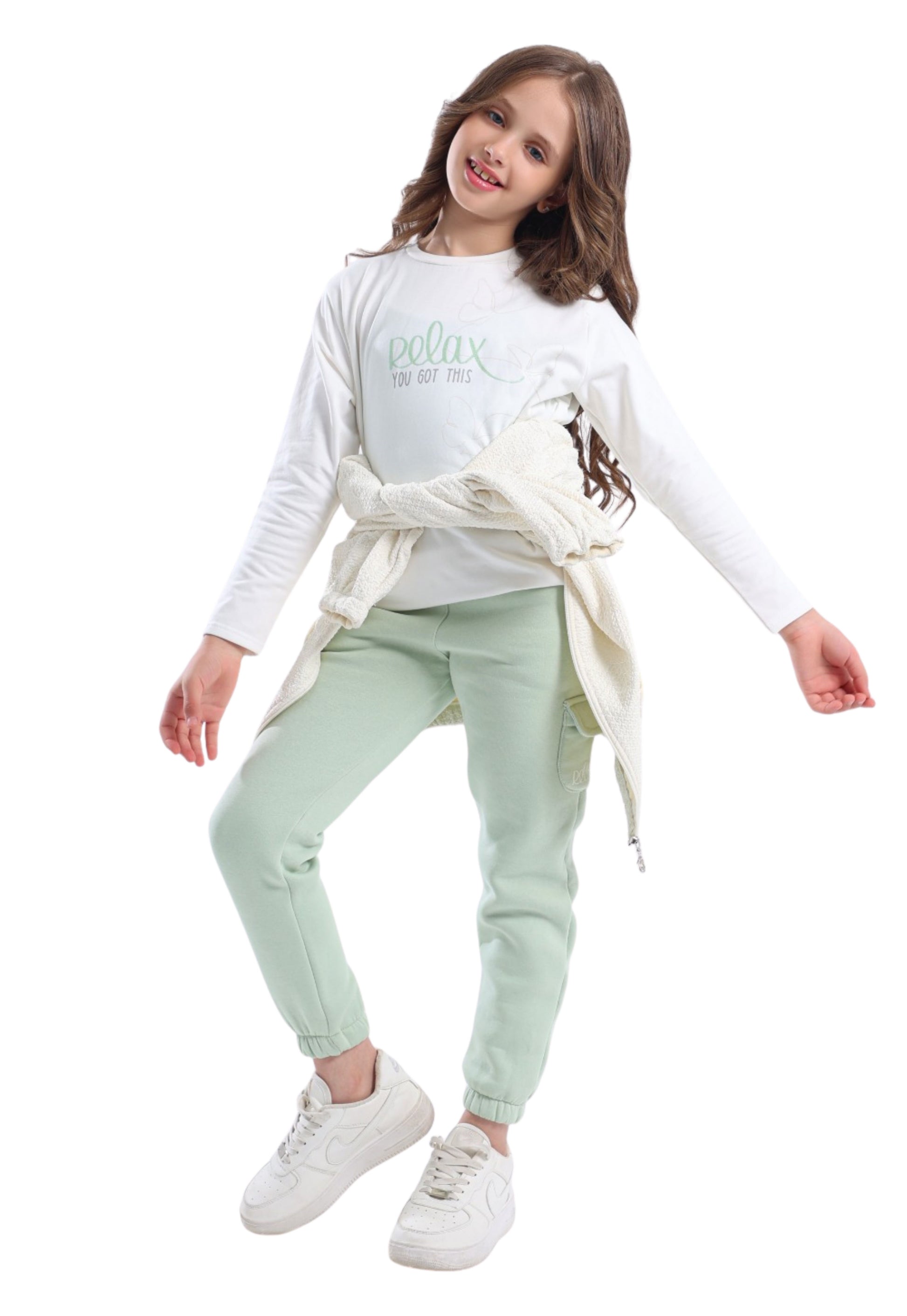 • تيشيرت أبيض مطبوع بعبارة “Relax You Got This”.